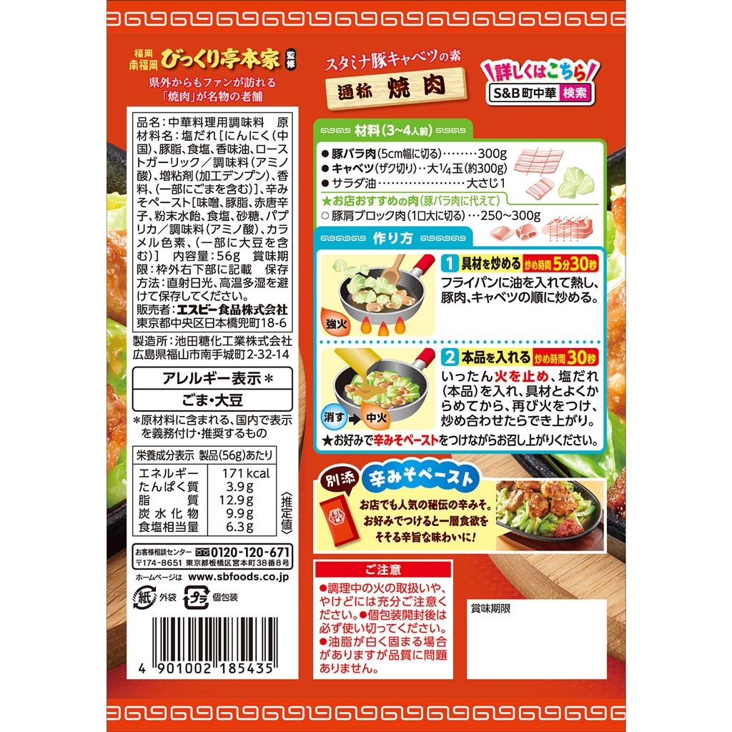 塩だれ[にんにく(中国)、豚脂、食塩、香味油、ローストガーリック/調味料(アミノ酸)、増粘剤(加工デンプン)、香料、(一部にごまを含む)]、辛みそペースト[味噌、豚脂、赤唐辛子、粉末水飴、食塩、砂糖、パプリカ/調味料(アミノ酸)、カラメル色素、(一部に大豆を含む)]