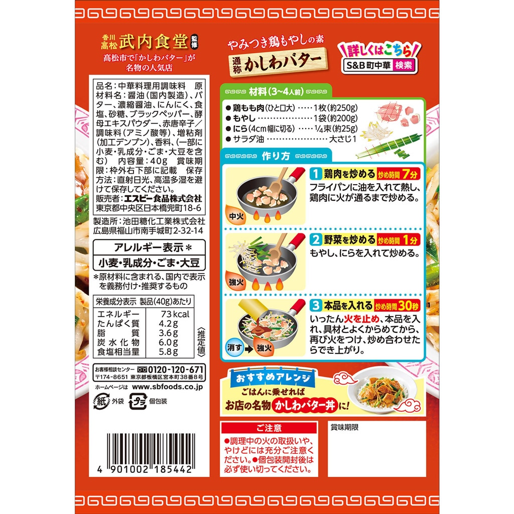 醤油(国内製造)、バター、濃縮醤油、にんにく、食塩、砂糖、ブラックペッパー、酵母エキスパウダー、赤唐辛子/調味料(アミノ酸等)、増粘剤(加工デンプン)、香料、(一部に小麦・乳成分・ごま・大豆を含む)