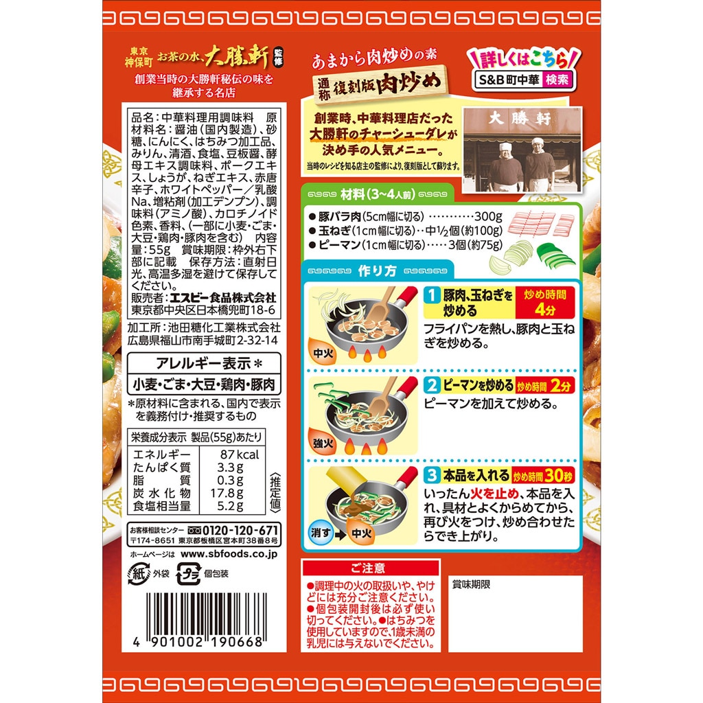 醤油(国内製造)、砂糖、にんにく、はちみつ加工品、みりん、清酒、食塩、豆板醤、酵母エキス調味料、ポークエキス、しょうが、ねぎエキス、赤唐辛子、ホワイトペッパー/乳酸Na、増粘剤(加工デンプン)、調味料(アミノ酸)、カロチノイド色素、香料、(一部に小麦・ごま・大豆・鶏肉・豚肉を含む)