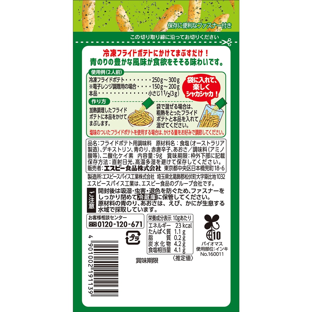 冷凍フライドポテトにかけてまぶすだけ。青のりの豊かな風味が食欲をそそる味わいです。量の調節がしやすい、ファスナー付き袋タイプ。