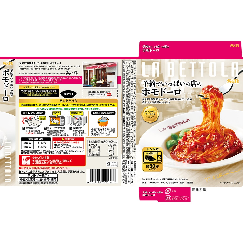 パスタソース[トマト・ピューレーづけ(イタリア製造)、トマトピューレー、ソテー・ド・オニオン、コーン油、トマトペースト、野菜ペースト、オリーブオイル、食塩、トマト濃縮エキス、マッシュルームエキスパウダー、ガーリックペースト、バジル/乳化剤、調味料(アミノ酸等)、酸味料、カラメル色素、香料、(一部に小麦・乳成分・大豆・鶏肉・豚肉を含む)]、トッピング[チーズ、(一部に乳成分を含む)]
