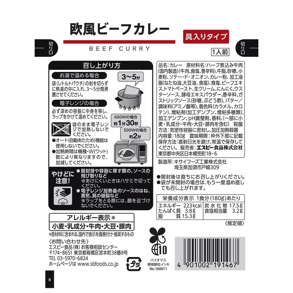 ハーブ煮込み牛肉(国内製造)(牛肉、食塩、香辛料)、牛脂、砂糖、小麦粉、ソテー・ド・オニオン、カレー粉、加工油脂(なたね油、大豆油、食塩)、食塩、ビーフエキス、トマトペースト、生クリーム、にんにく、ウスターソース、酵母エキスパウダー、香辛料、ガストリックソース(砂糖、ぶどう酢)、バター/調味料(アミノ酸等)、着色料(カラメル、カロテン)、増粘剤(加工デンプン、増粘多糖類)、加工デンプン、pH調整剤、香料、(一部に小麦・乳成分・牛肉・大豆・豚肉を含む)
